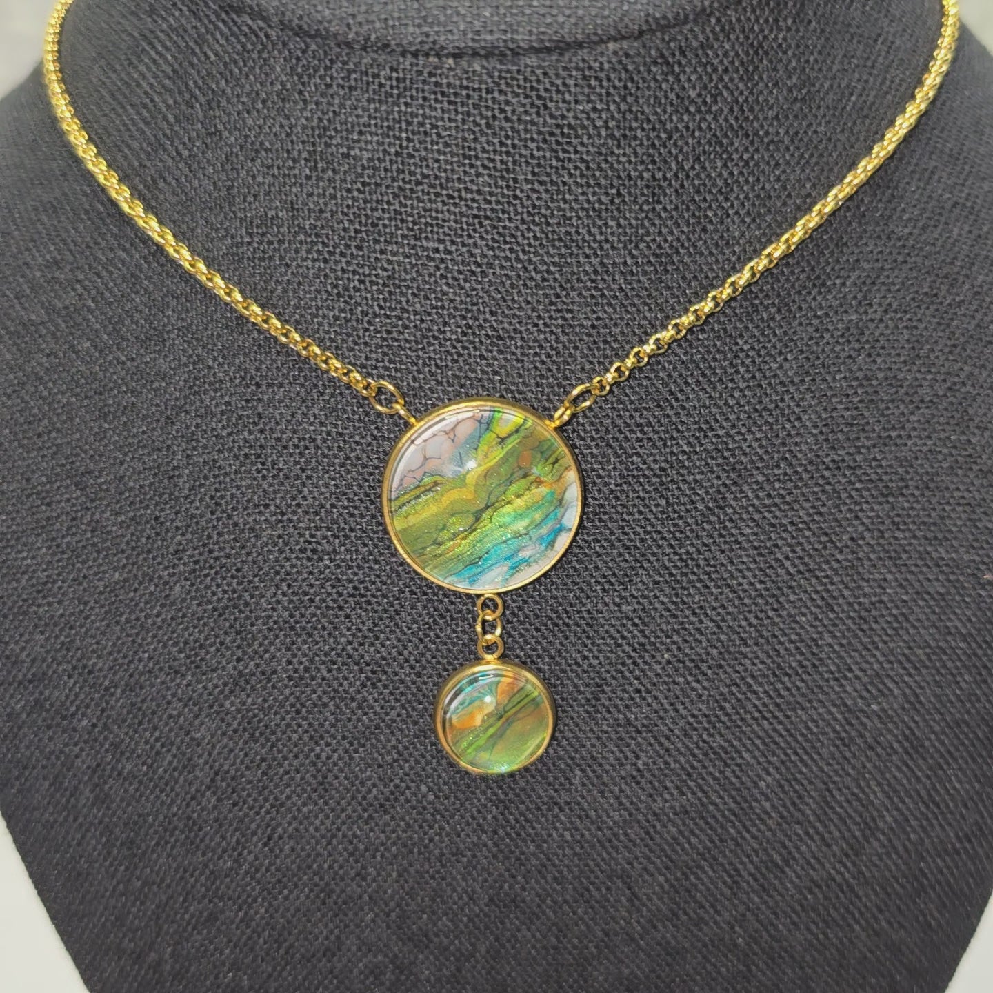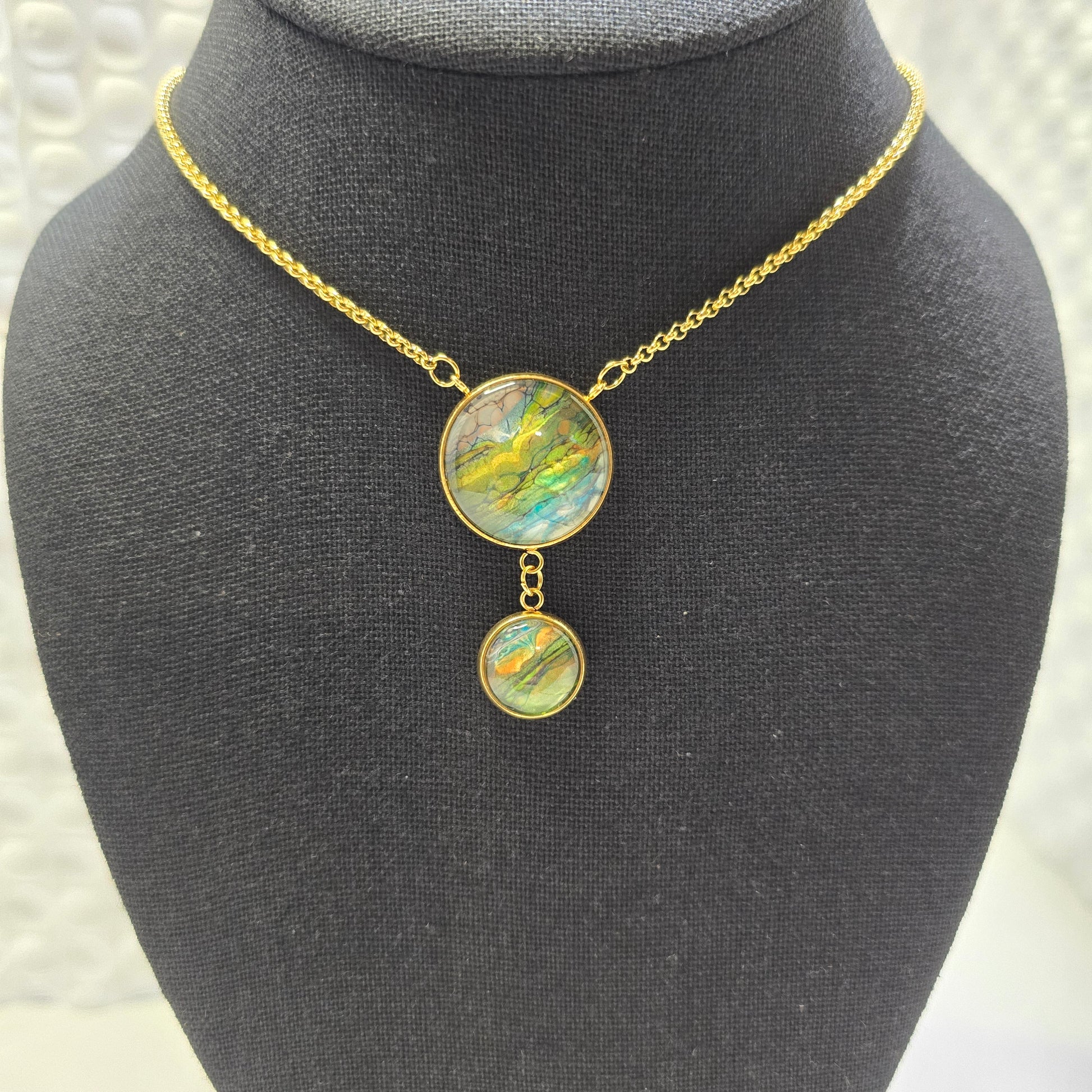 Necklace featuring a neutral color pallet created with acrylic paint then applied to glass and set into a gold plated pendant on an adjustable chain. This necklace is ment to be pulled over your head, no clasp.