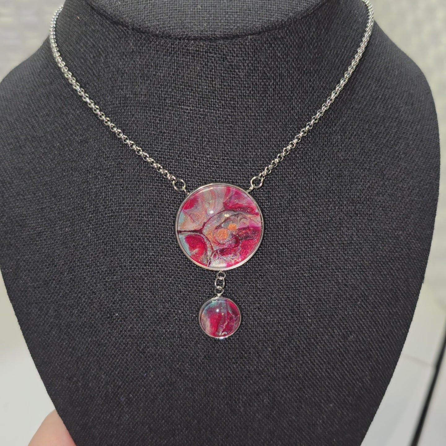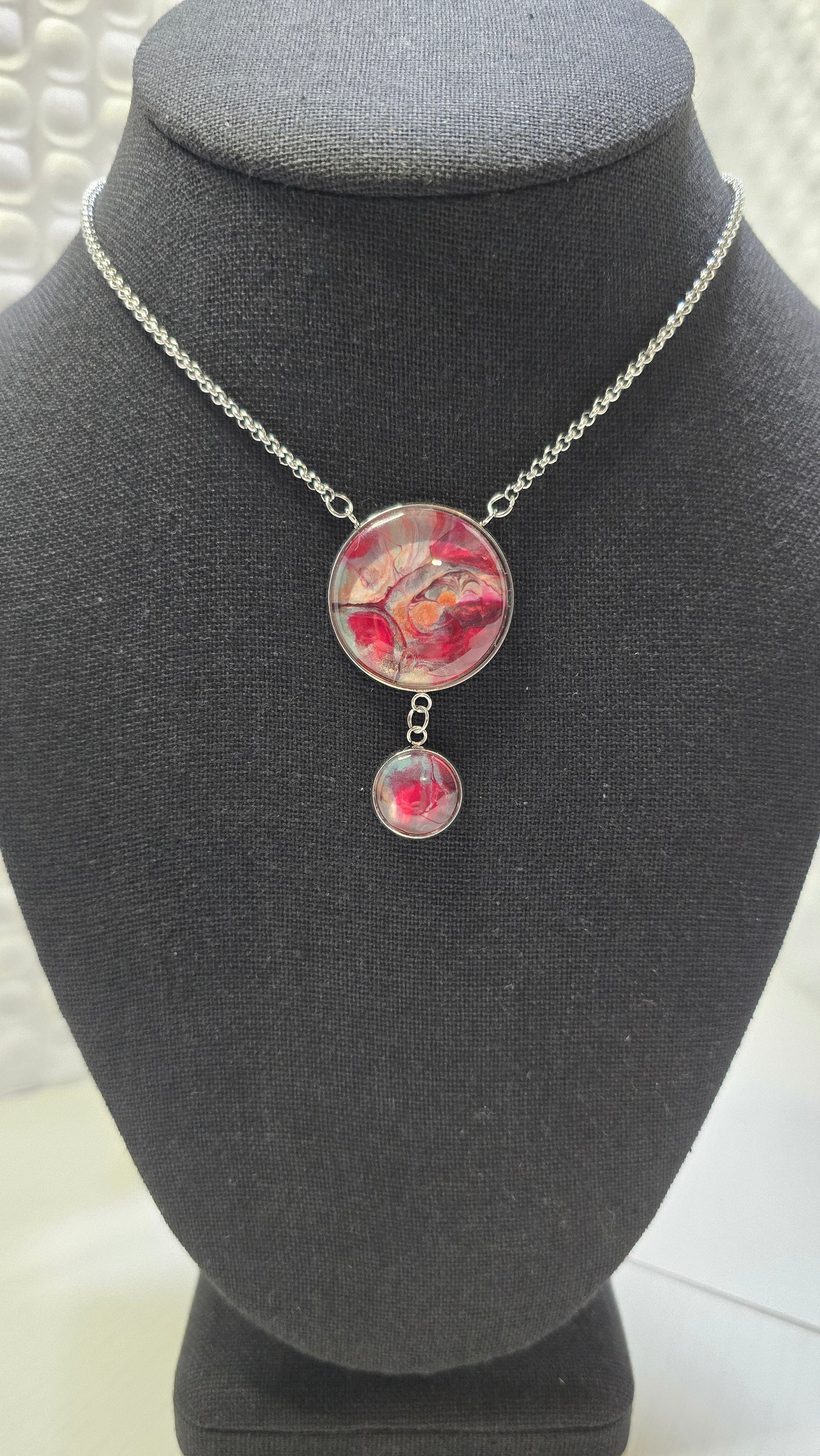 Adjustable necklace designed to be pulled over your head. No clasp