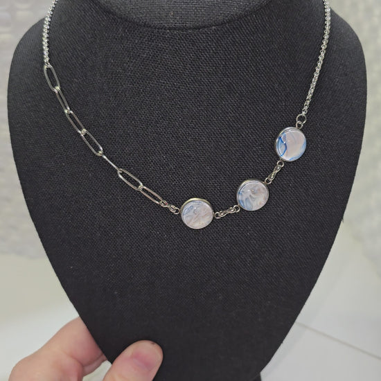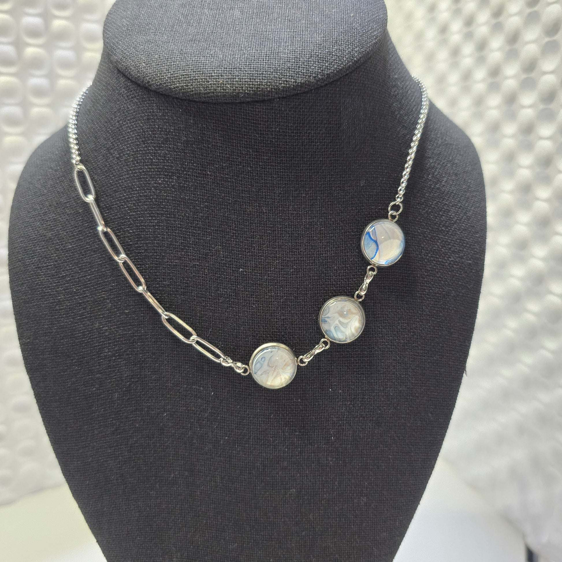 Adjustable necklace designed to be pulled over your head. No clasp