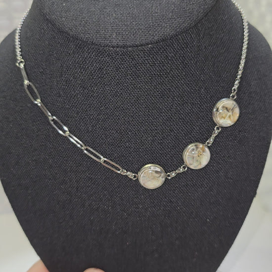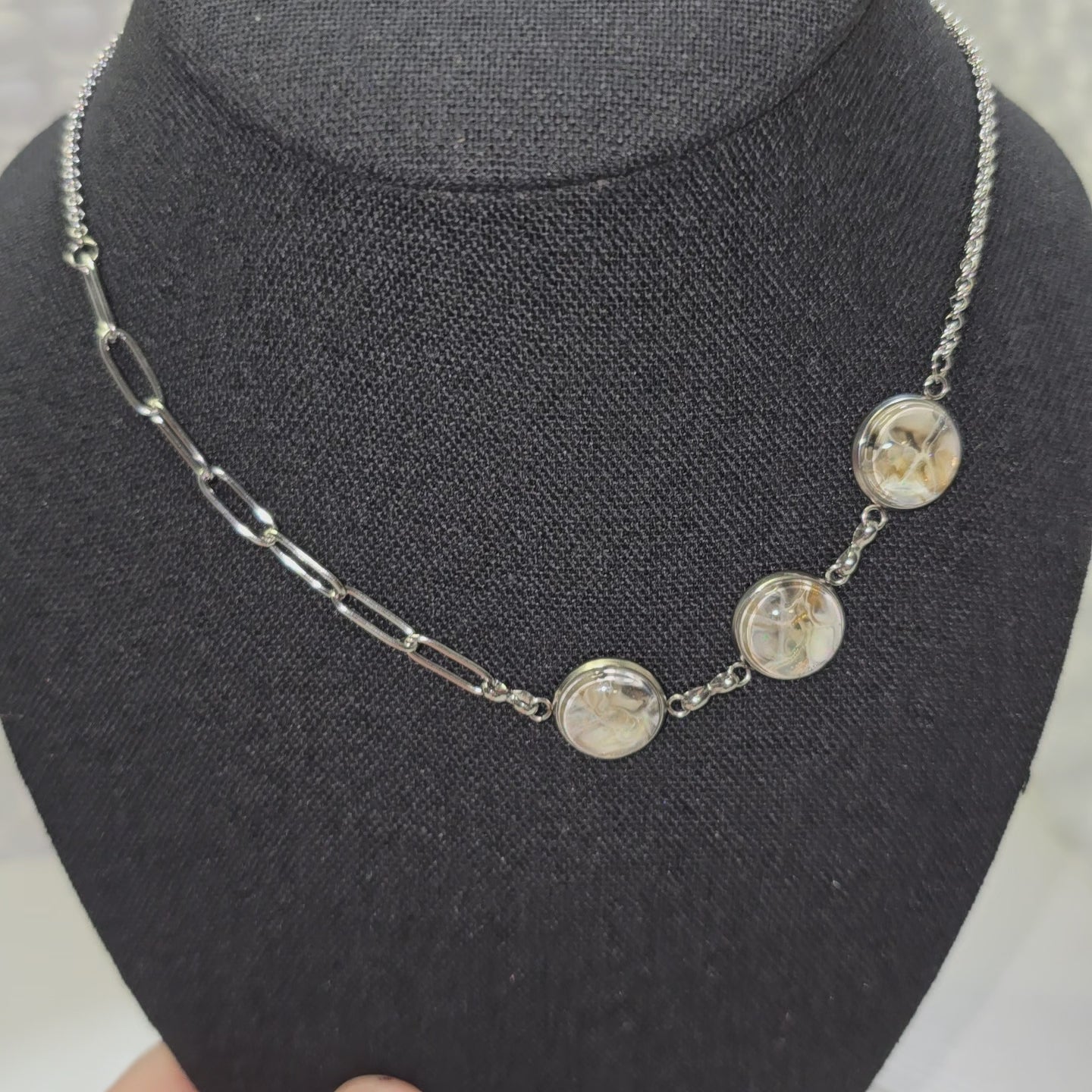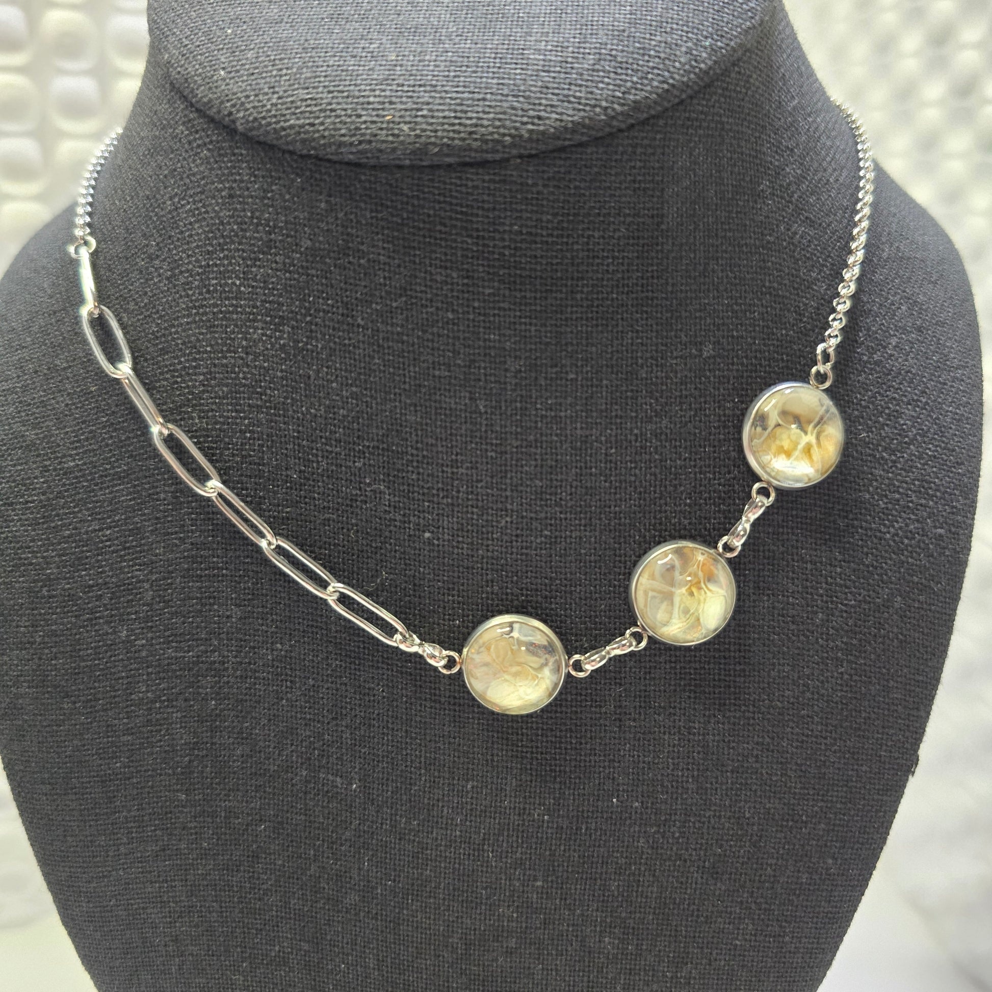 Adjustable necklace designed to be pulled over your head. No clasp