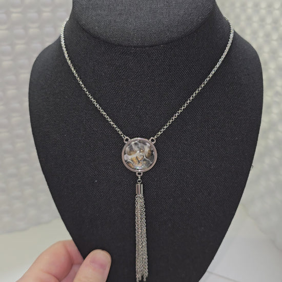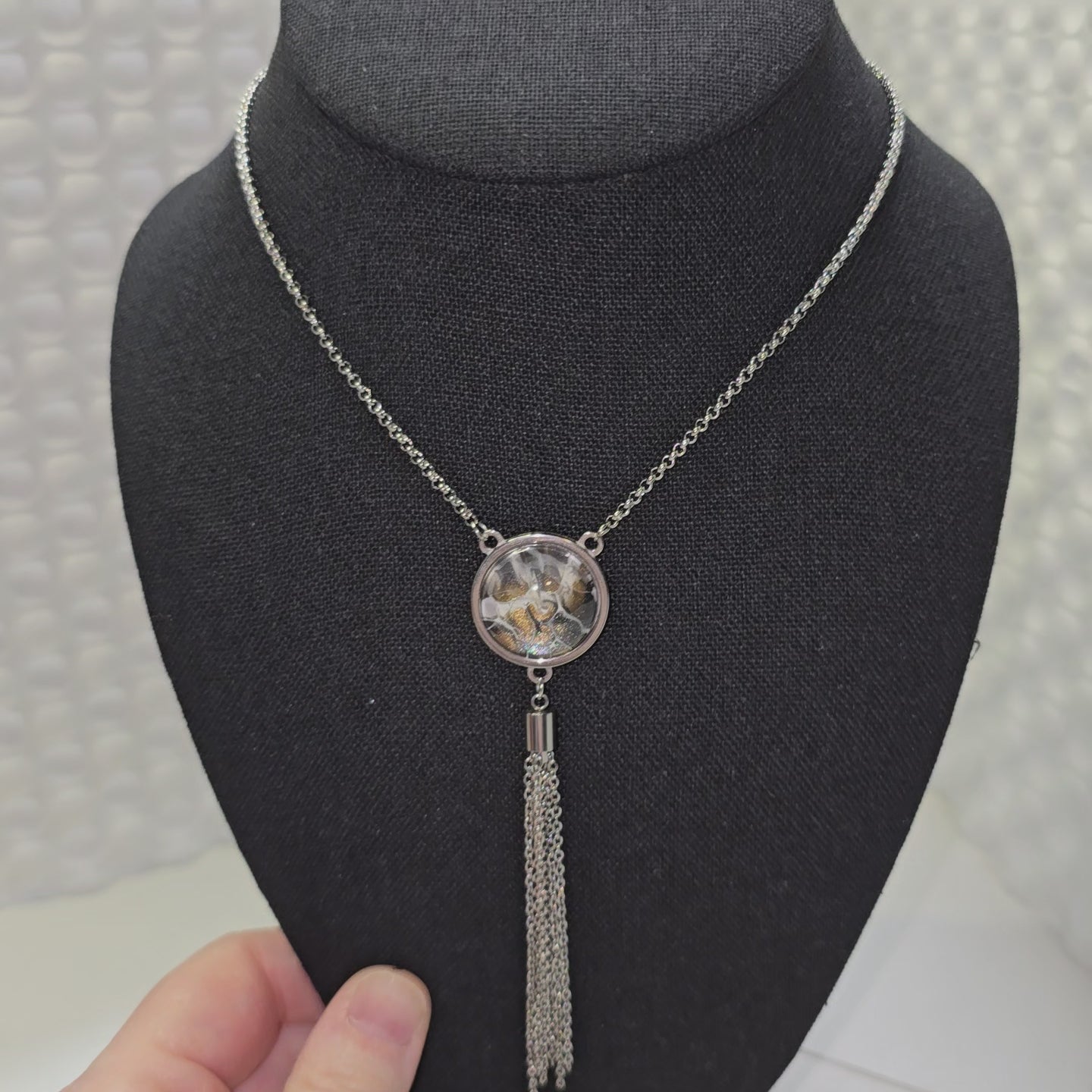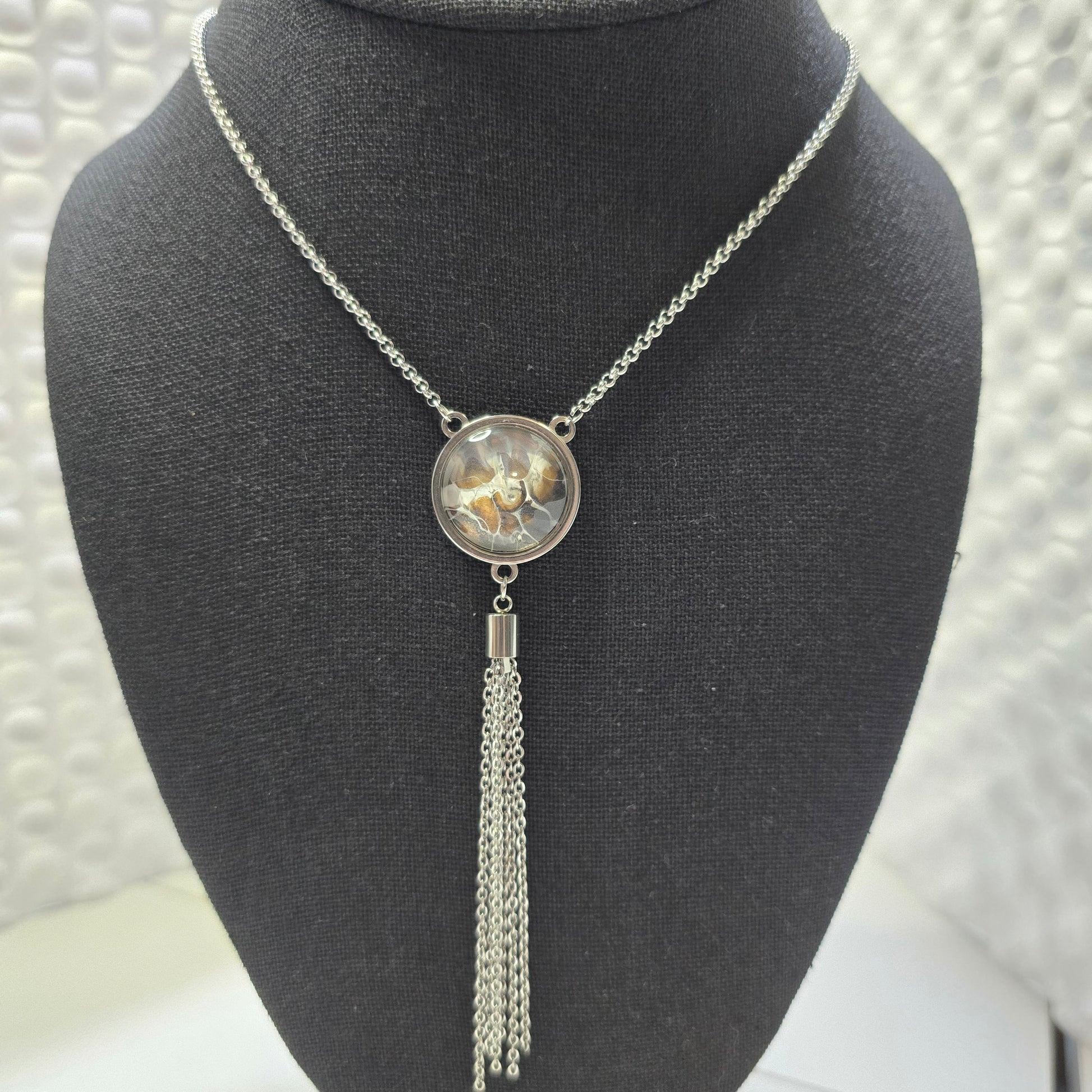 Adjustable necklace designed to be pulled over your head. No clasp